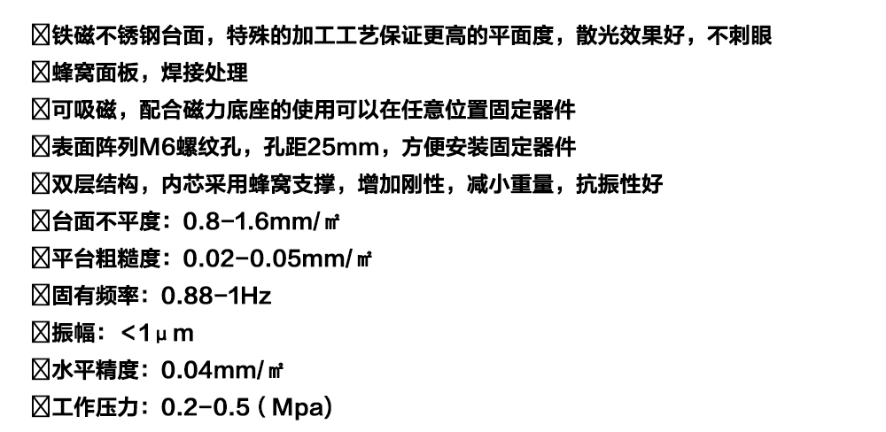 描述:台面不平度:0.8-1.6mm/㎡ 平台粗糙度:0.02-0.05mm/㎡ 固有频率:0.88-1Hz 振幅:<1μm 水平精度:0.04mm/㎡ 工作压力:0.2-0.5(Mpa)