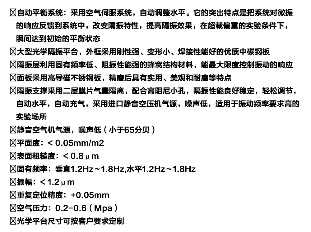 描述:静音空气机气源,噪声低(小于65分贝) 平面度:< 0.05mm/m2 表面粗糙度:< 0.8μm 固有频率:垂直1.2Hz~1.8Hz,水平1.2Hz~1.8Hz 振幅:< 1.2μm 重复定位精度:+0.05mm 空气压力:0.2-0.6(Mpa) 光学平台尺寸可按客户要求定制